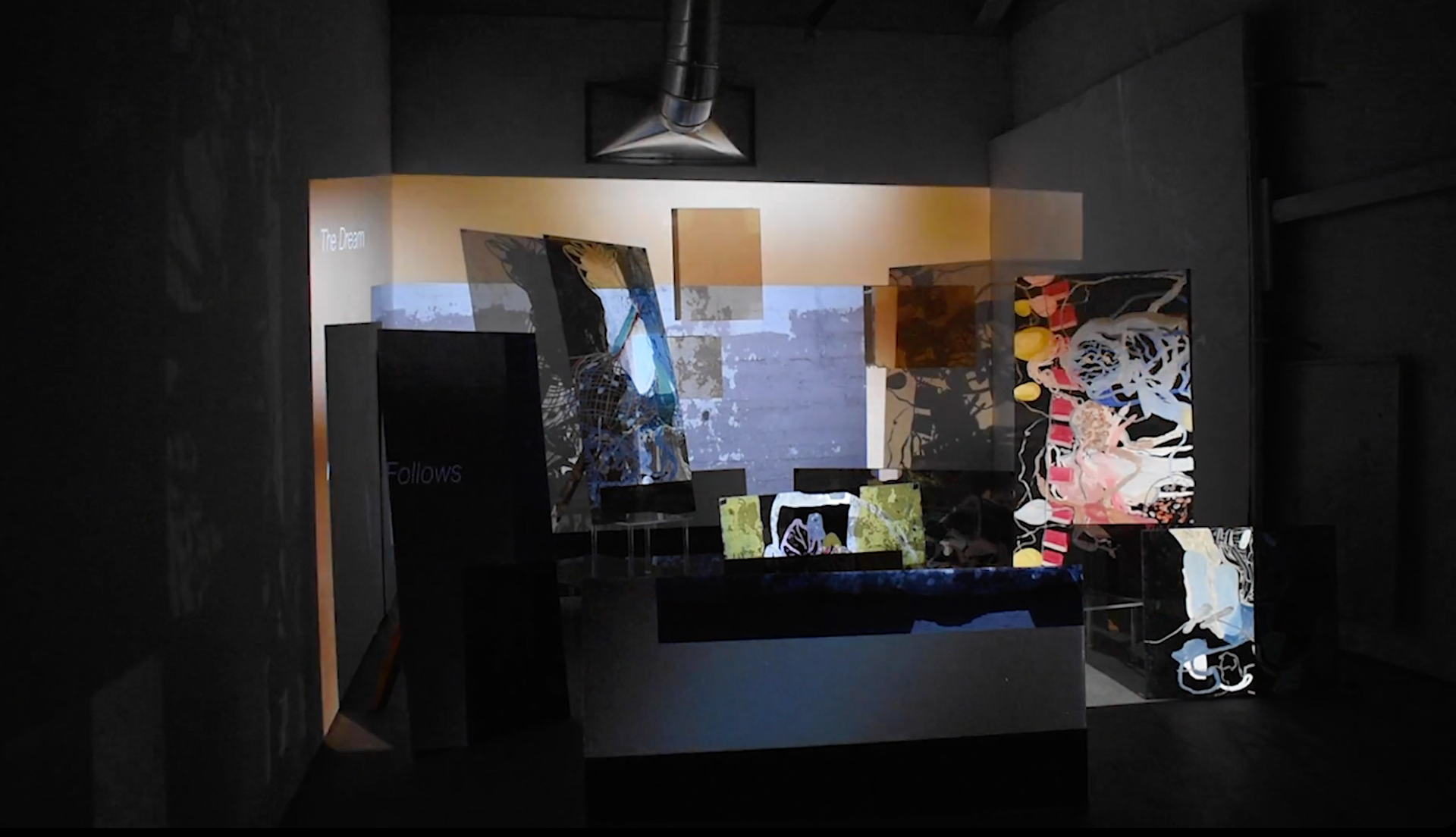 The Dream Follows the Mouth, video installation with oil paint on plexiglass, 2021